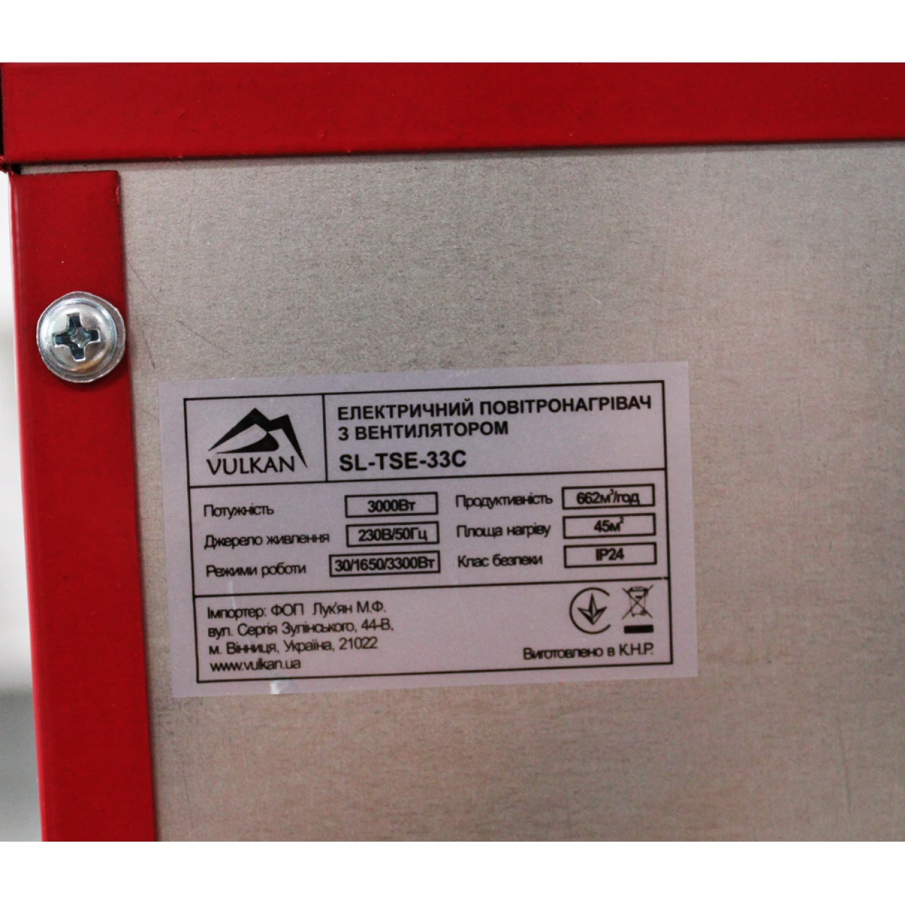 Vulkan SL-TSE-33C -якісний електричний обігрівач промислового класу із живленням від мережі 220 В. Підходить для обігріву житлових та нежитлових приміщень площею 45 кв.м. При обігріві споживає від 1650 до 3300 Вт потужності. Також є можливість увімкнути режим роботи без обігріву. Корпус виготовлений із сталі та додатково покритий порошковою фарбою.