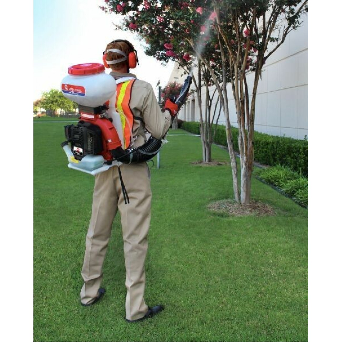 во время работы агрегат находится за спиной владельца, удерживается с помощью плечевых ремней. Фиксаторы помогают выставить нужную длину;